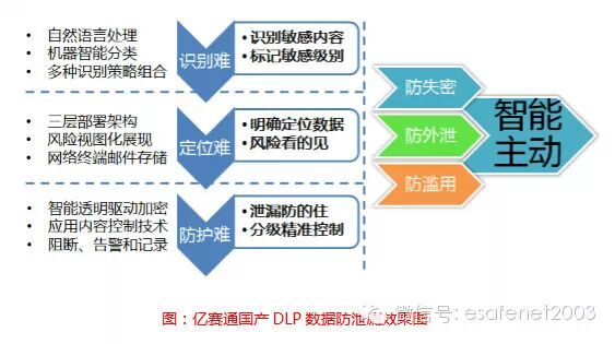 为解决以上难点,亿赛通提出了“让数据安全进入智能化防护时代”的理念,推出国产DLP数据防泄漏系统,并已服务于国内各大银行企业,实现了从终端防护、网络防护、邮件防护、数据审计一体化安全管理,它通过对敏感数据内容的识别,建立保护措施,最终实现数据在哪里、风险看的见、泄漏防的住的全方位保护效果。
